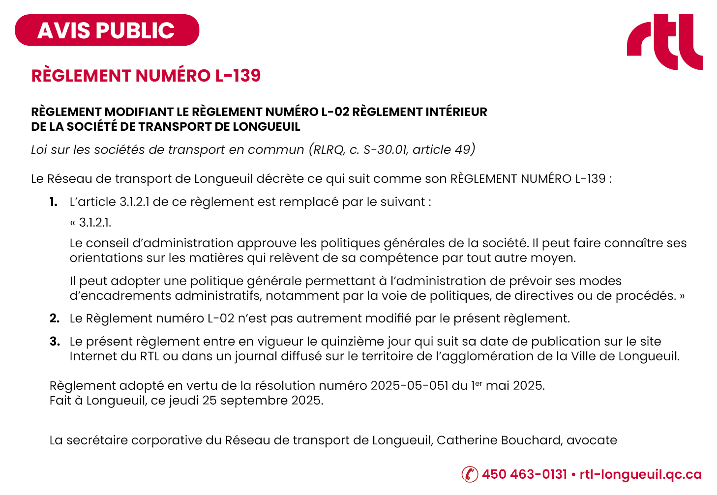 Le Réseau de transport de l'agglomération de Longueuil, en conformité avec l’article 26 de la Loi sur les sociétés de transport en commun, publie le calendrier des assemblées ordinaires du conseil d’administration pour l’année 2025, en vertu de la résolution numéro 2025-02-018, adoptée lors de l’assemblée ordinaire du 6 février 2025: